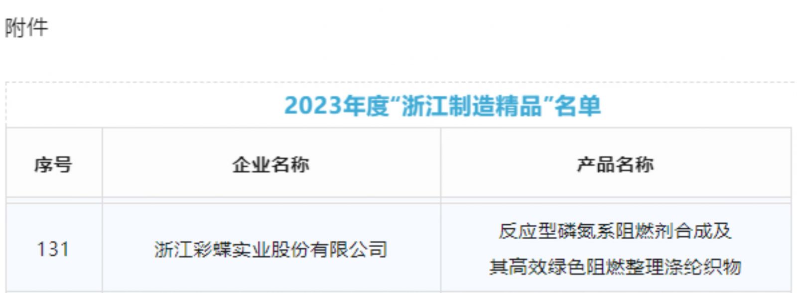 近日,浙江省經濟和信息化廳公布2023年度“浙江制造精品”名單,彩蝶實業研發產品”反應型磷氮系阻燃劑合成及其高效綠