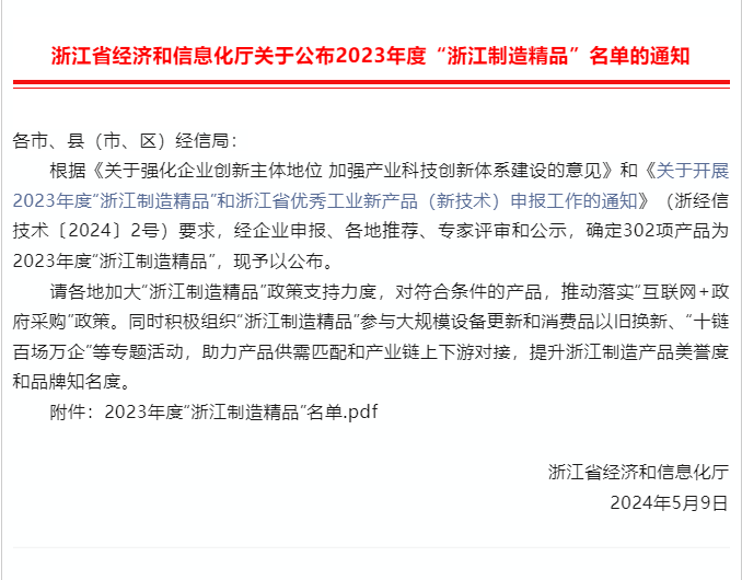 “浙江制造精品”以提升浙江制造產品市場知名度、競爭力、附加值為主要目的,旨在重點選擇一批具有自主知識產權、技